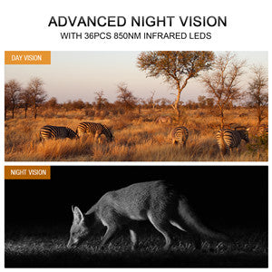 Equipped with 36pcs 850nm LEDs, the trail camera produces detailed black and white night vision images (Color picture during the day).