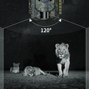 Das 120-Grad-Weitwinkelobjektiv der Wildkamera bietet einen riesigen Aufnahmebereich und eine IR-LED für Nachtaufnahmen sowie eine empfindliche und automatische IR-Technologie zum Aufnehmen von Bildern und Videos bei Tag und Nacht bei 65 Fuß/20 m.