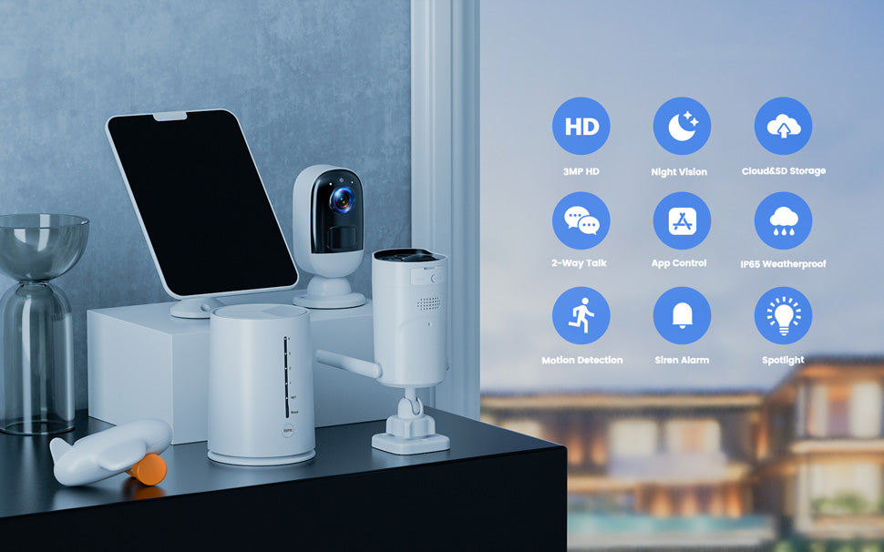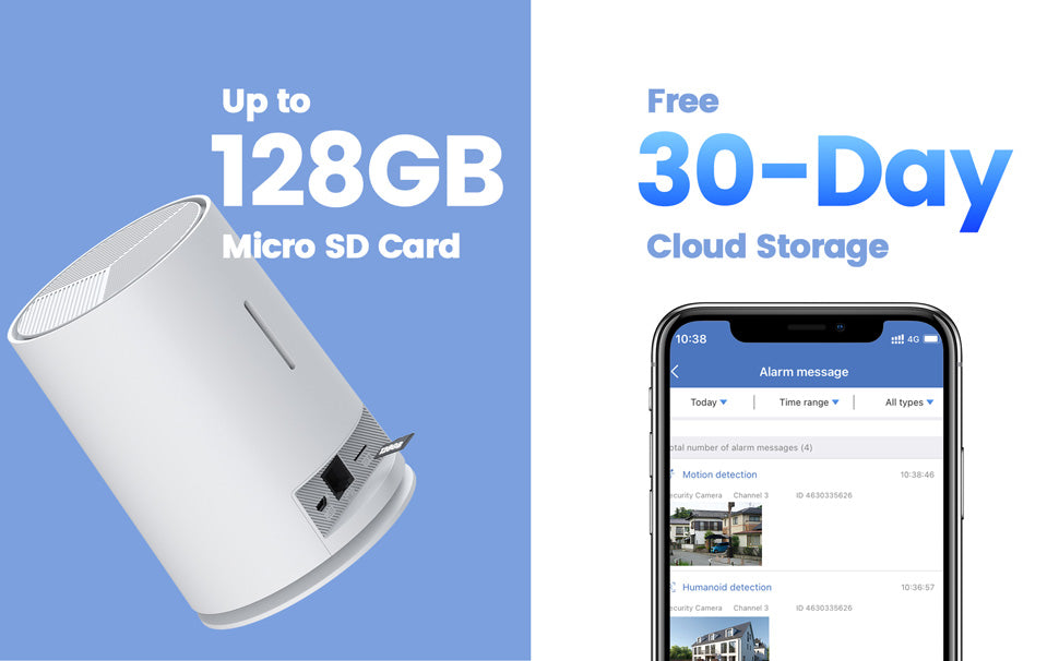 Sicherer und verschlüsselter Speicher: Die Überwachungskamera für den Außenbereich unterstützt sowohl Micro-SD-Karten (bis zu 128 GB) als auch Cloud-Speicher (kostenlose 30-Tage-Testversion).