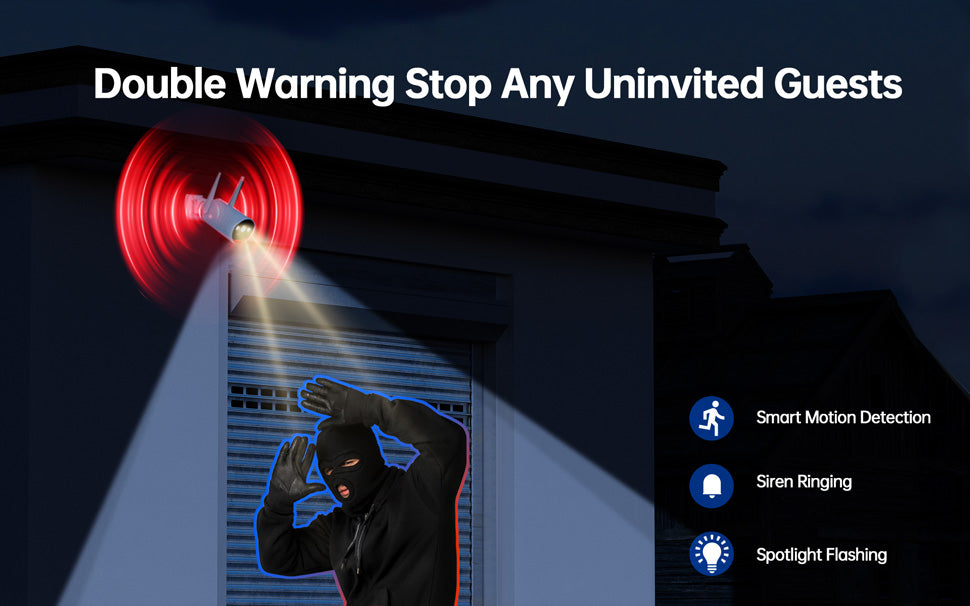 Intelligenter PIR-Sensor + sofortige Warnungen: Wenn eine verdächtige Bewegung erkannt wird, sendet die Kamera eine Warnmeldung an das Telefon. Sie können den Scheinwerfer und die Sirene aktivieren, um Eindringlinge zu warnen. Passen Sie die PIR-Empfindlichkeit an und legen Sie einen Zeitplan fest, um unerwünschte Warnungen einfach herauszufiltern.
