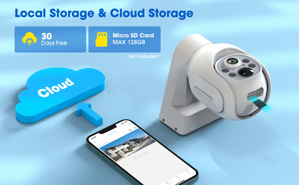 You can choose to save all motion detection video clips locally on a micro SD card up to 128GB (not included) or back up to the Ubox cloud (30-day free trial)
