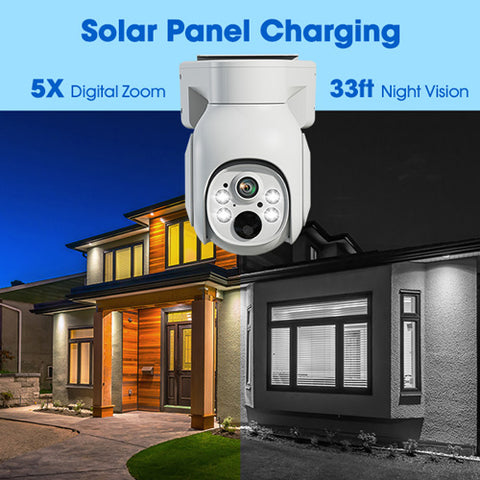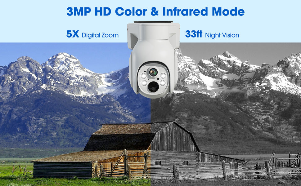 【3MP HD Color Night Vision & PTZ】With 3MP resolution, the solar-powered security camera captures sharp, clear footage for more visual details. Provide both color and infrared night vision modes for your night recordings, supporting night vision up to 10 meters (33 feet). With 355° horizontal and 90° vertical rotation, you can have a perfect 360° field of vision without blind spots. In addition, 5x digital zoom can help you see more details.